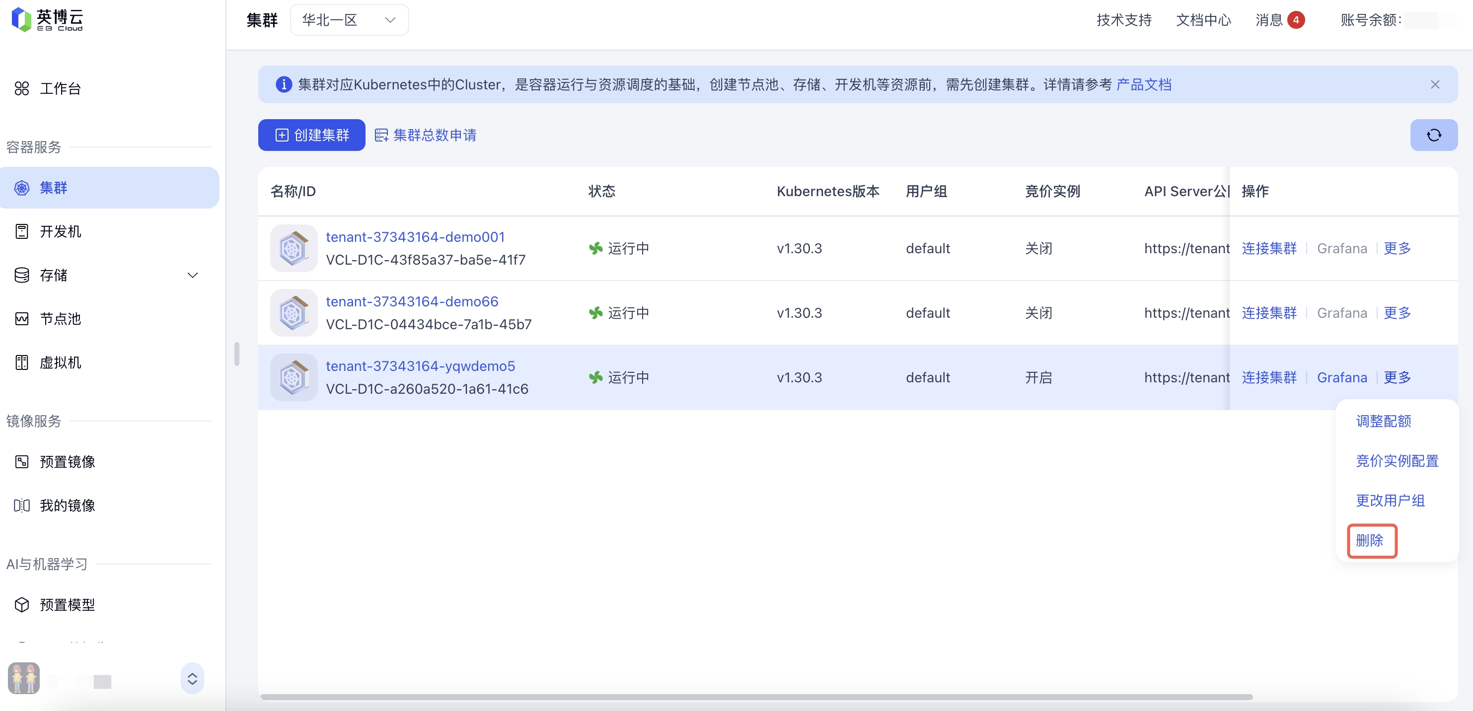 在集群列表页面,选择需要删除的集群,单击操作栏