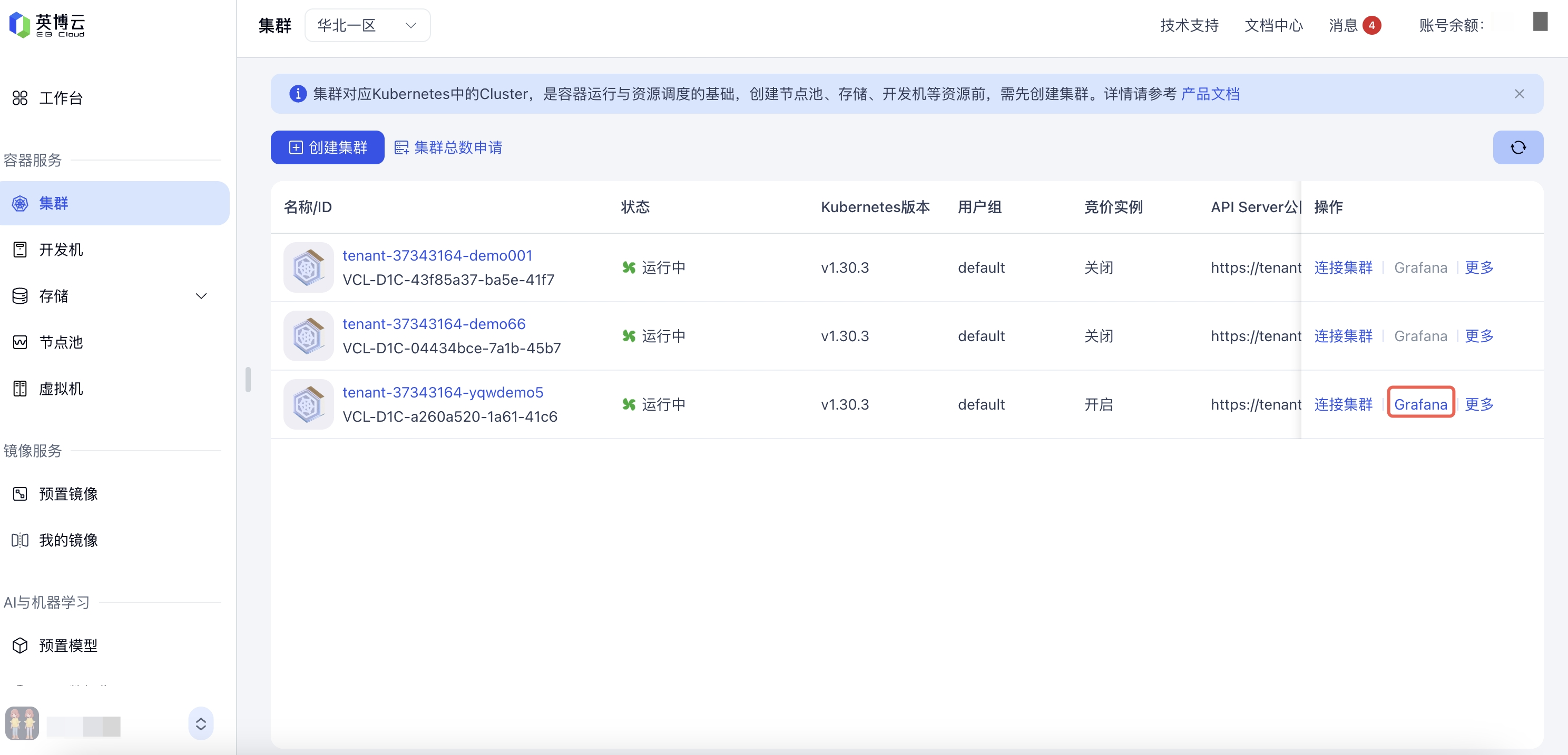 - 在集群列表页面,选择查询监控指标或事件的集群,单击操作栏 Grafana。