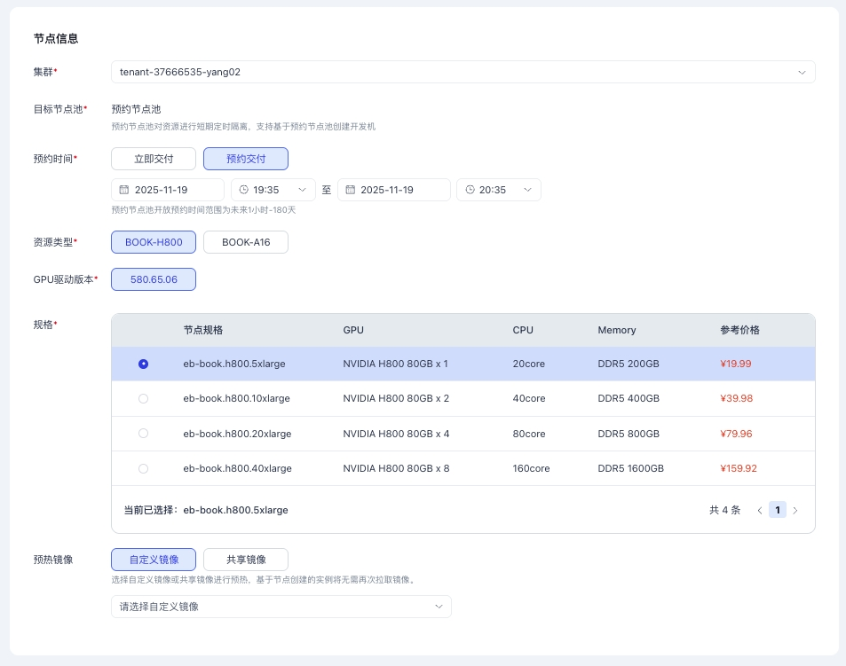 - 在节点池列表页面,单击左上角 创建节点,选择您预约节点所在的分区、配置归属集群、GPU节点池规格、预约时间、预热镜像和数量后点击击 确定 完成操作。