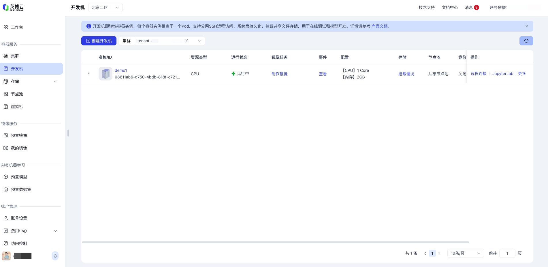 - Docker支持:支持开发机启用Docker功能,允许用户在开发机内运行其它容器。