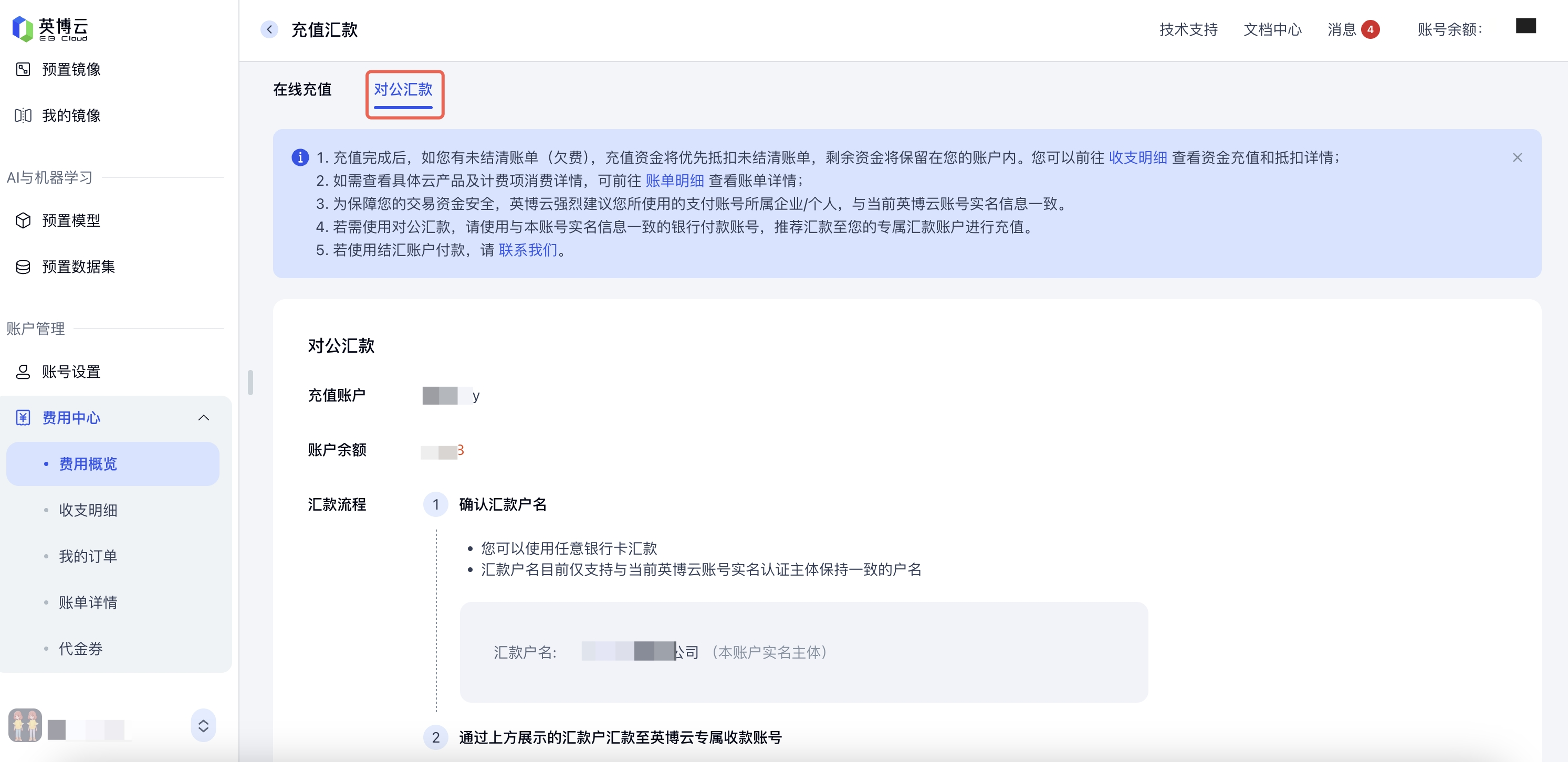 1. 对公汇款仅支持“企业认证”账号使用,汇款户名需与当前英博云账号企业实名认证主体保持一致。