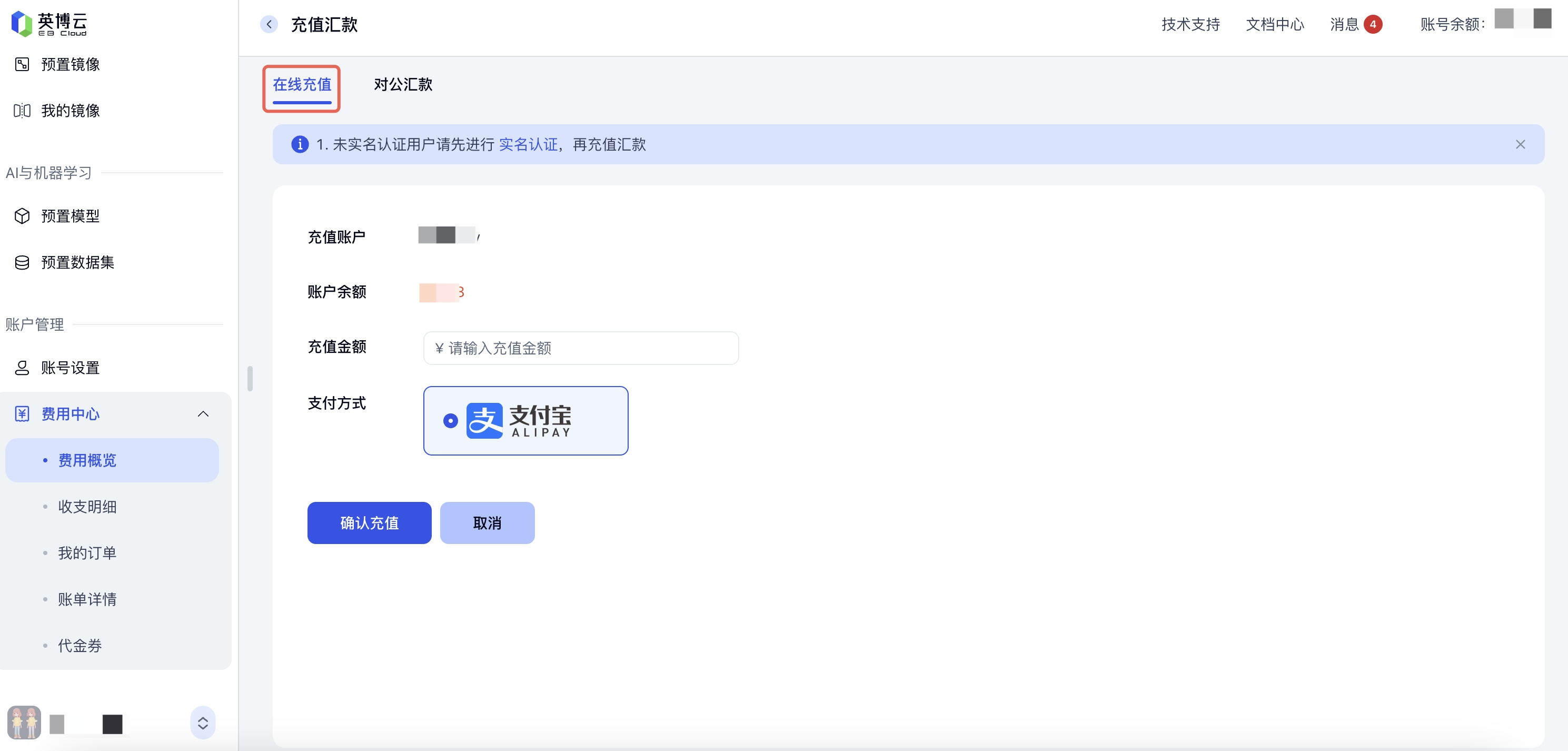 - 输入充值金额,单击 确认充值 按钮,使用支付宝APP扫描二维码进行付款,即可完成余额充值。