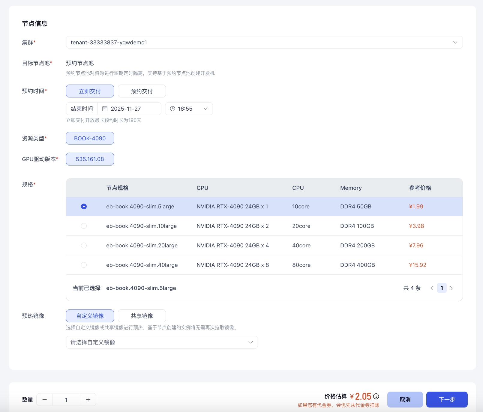 - 3. 目前仅4090专属分区支持创建预约节点,如华北二区。