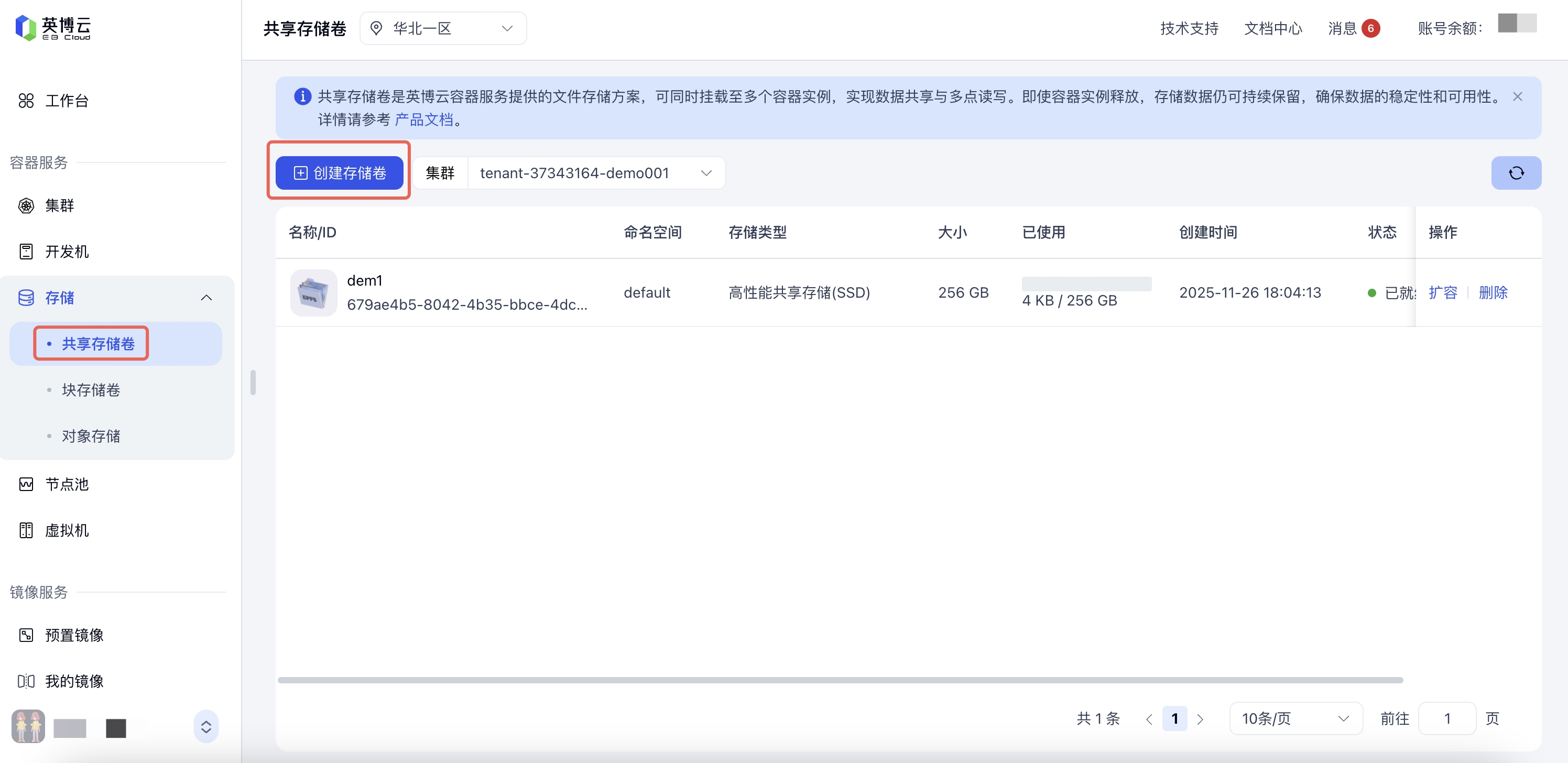 - 在左侧页面栏,选择【存储】-【共享存储】,进入共享存储列表页