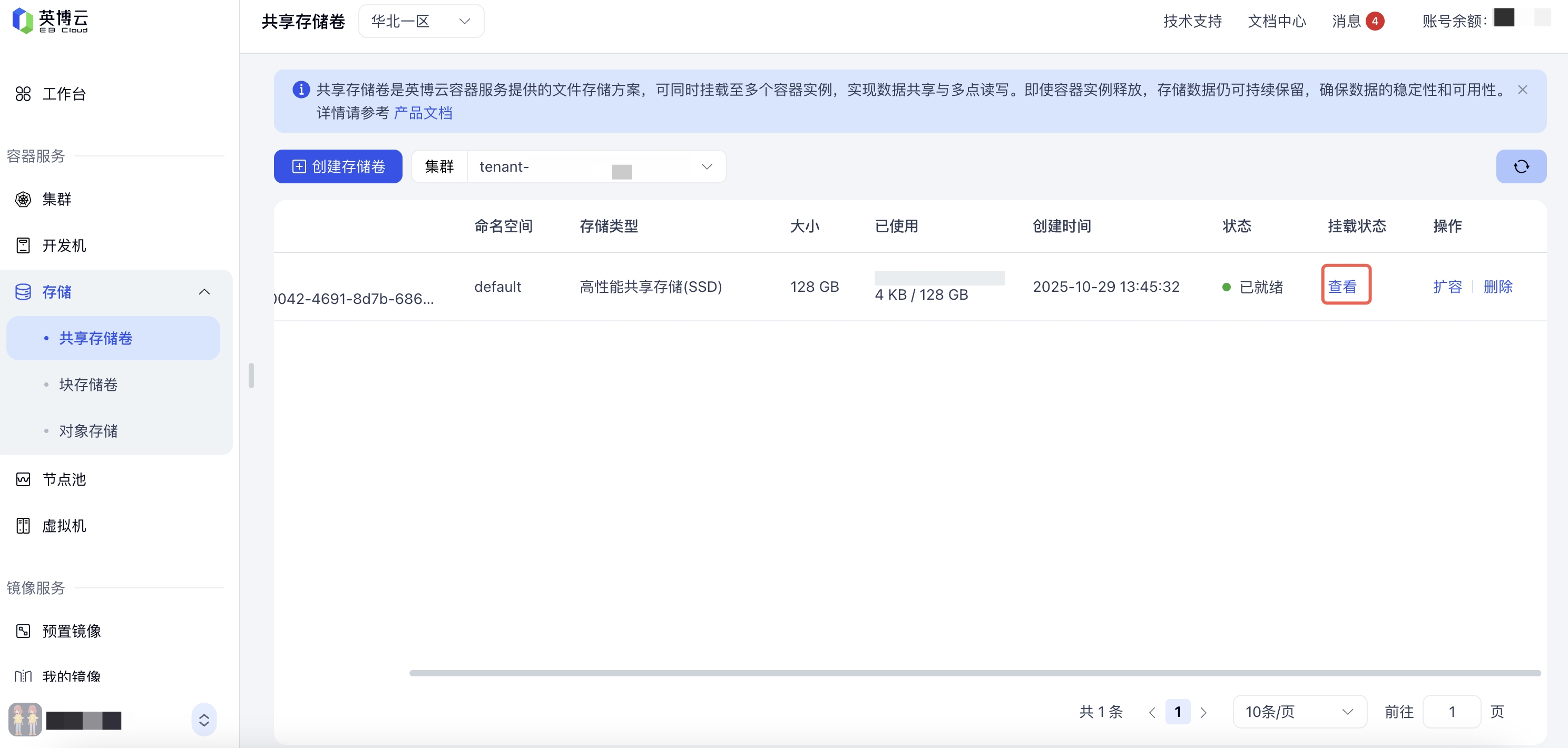 当您需要了解共享存储卷是否挂载时,可以查看对应存储卷的挂载情况,操作步骤如下: