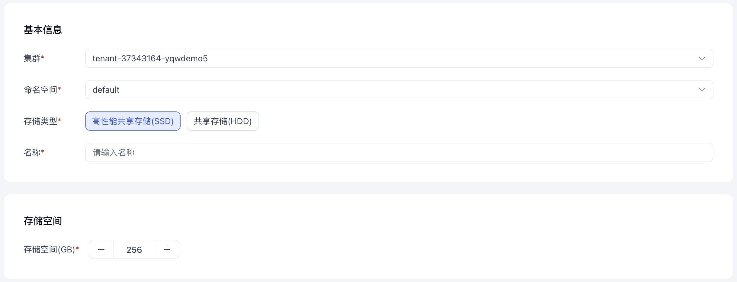 - 在存储列表页面,单击左上角 创建存储卷,配置存储的名称、归属集群和命名空间、存储类型、存储空间(GB)。