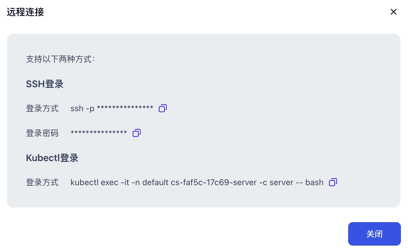 - 在对应虚拟机所在行,选择 操作 > 远程连接。弹出远程连接方式,复制粘贴连接方式和密码完成登录。